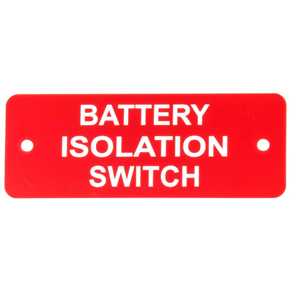 Red 'Battery Isolation Switch' label with white engraving and two drill holes.