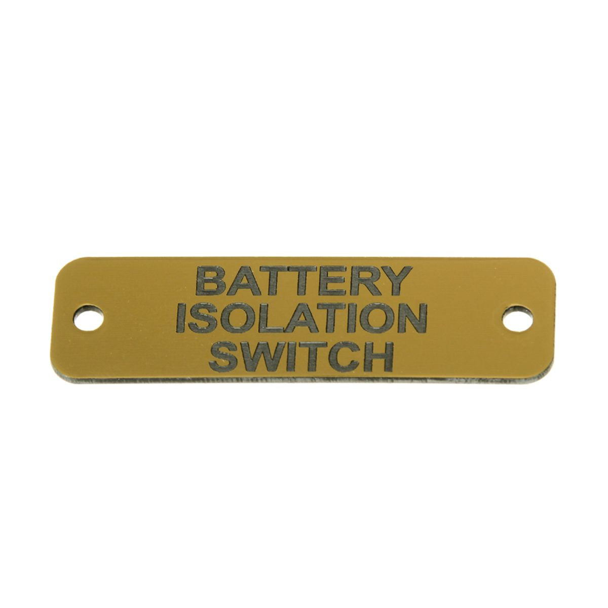 Gold 'Battery Isolation Switch' label with black engraving and two drill holes.