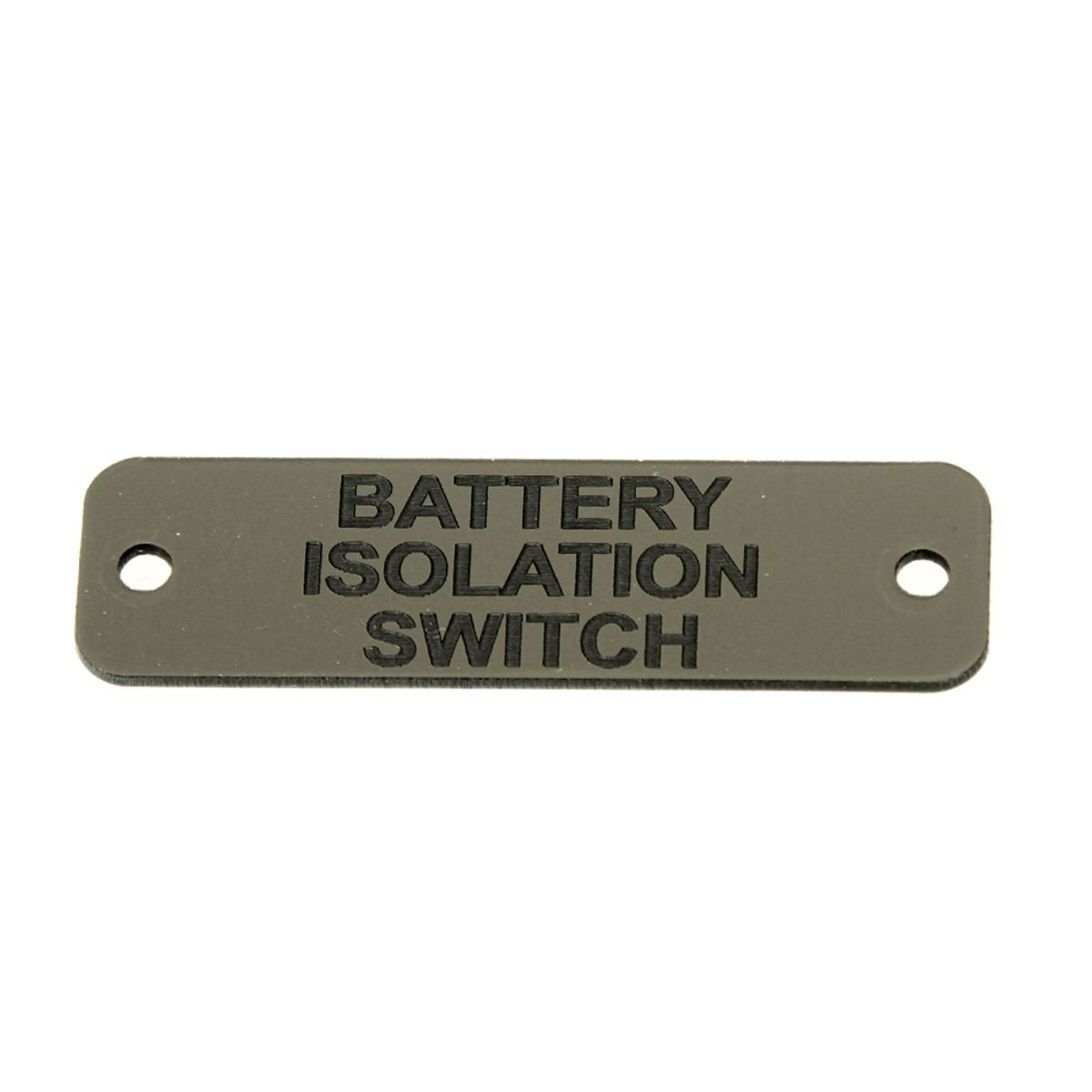 Silver 'Battery Isolation Switch' label with black engraving and two drill holes.