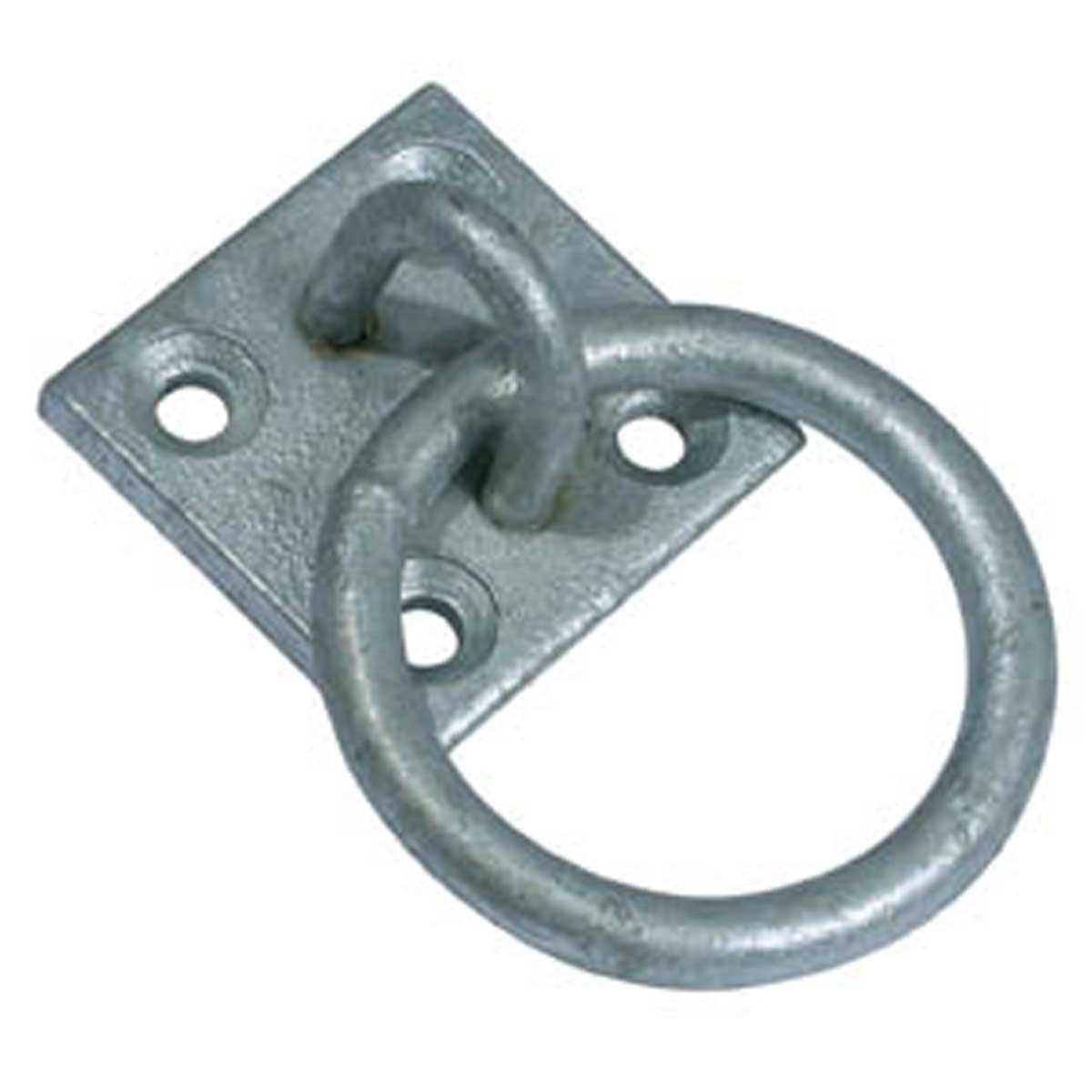 Galvanised steel binnacle ring eye plate suitable for mooring posts and attaching mooring lines and fender ropes etc to. The square plate measures 50 x 50mm, with 4 predrilled fixing holes, and the ring is 8mm x 50mm inner diameter.
