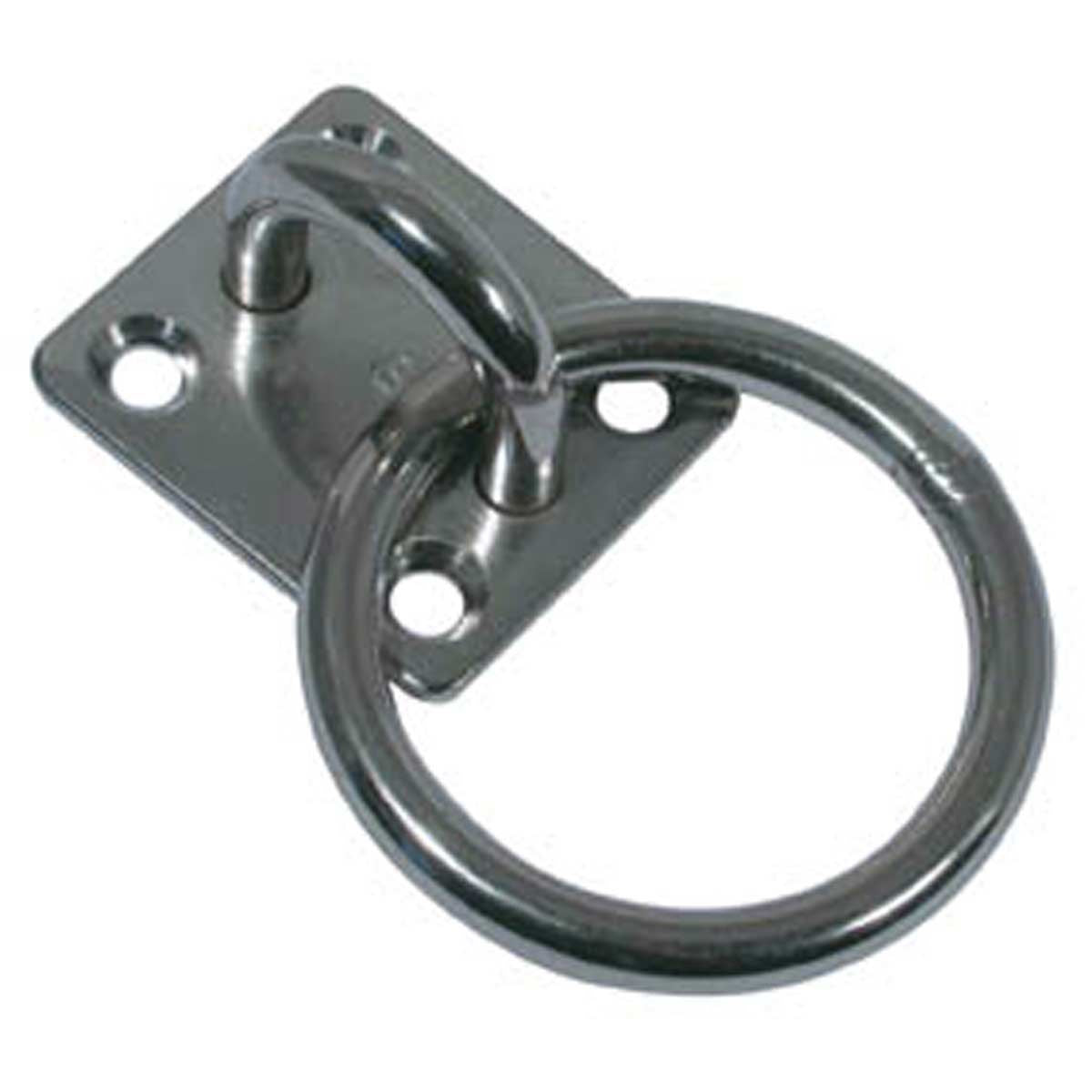 Stainless steel binnacle ring eye plate suitable for mooring posts and attaching mooring lines and fender ropes etc to. The square plate measures 50 x 40mm, with 4 predrilled fixing holes, and the ring is 8mm x 50mm inner diameter.