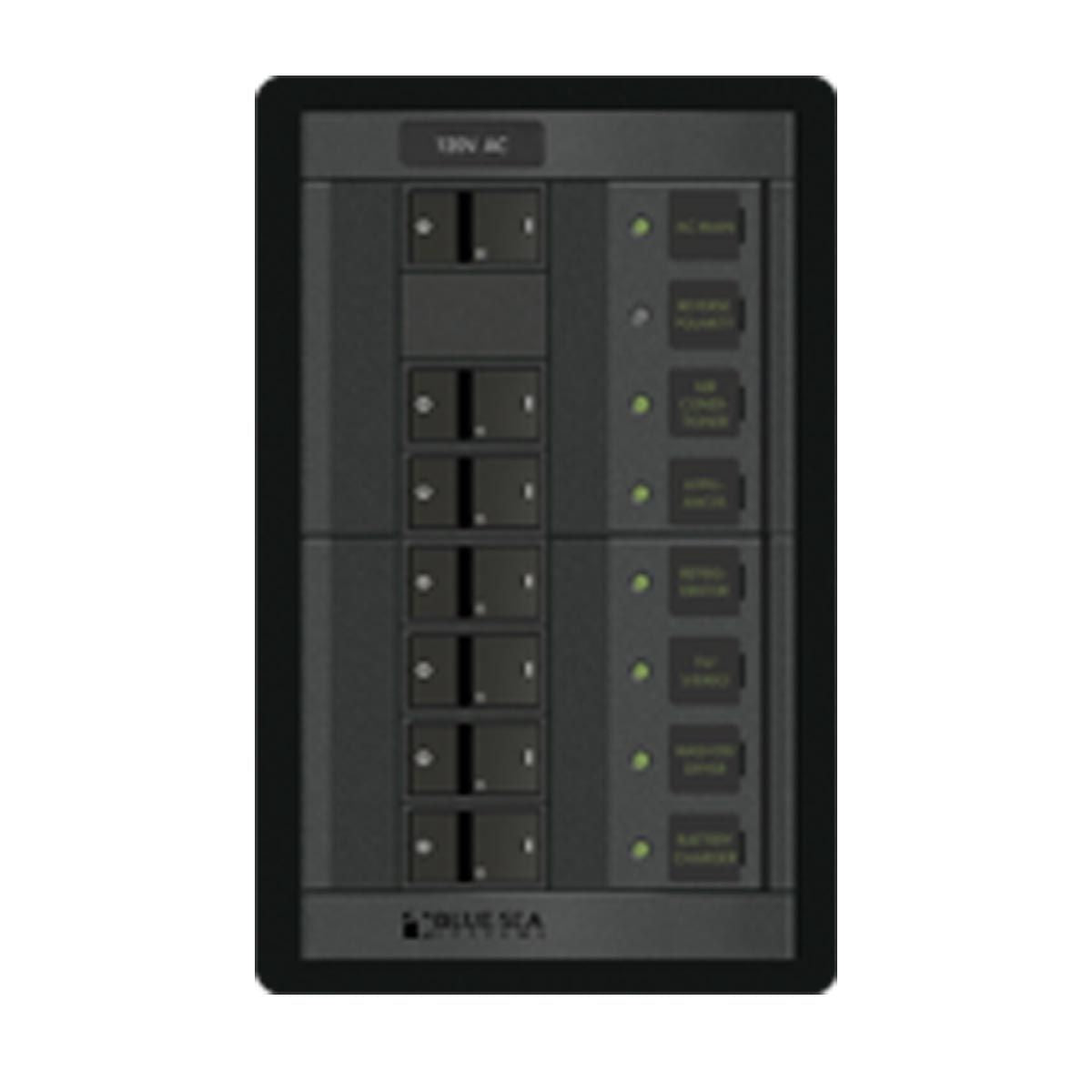 A 120V AC 360 panel system from Blue Sea Systems with six 15A single and one 30A double breakers. All circuit label positions are backlit.