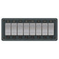 Blue Sea Contura waterproof switch panel featuring 8 ON-OFF rocker switches with LED switch ON indication. This 12V and 24V DC switch panel is rated IP66 waterproof to withstand water exposure normally encountered in above deck applications (salt spray, rain, hose washdowns and momentary immersions). Blue Sea 8261 horizontal panel in black.