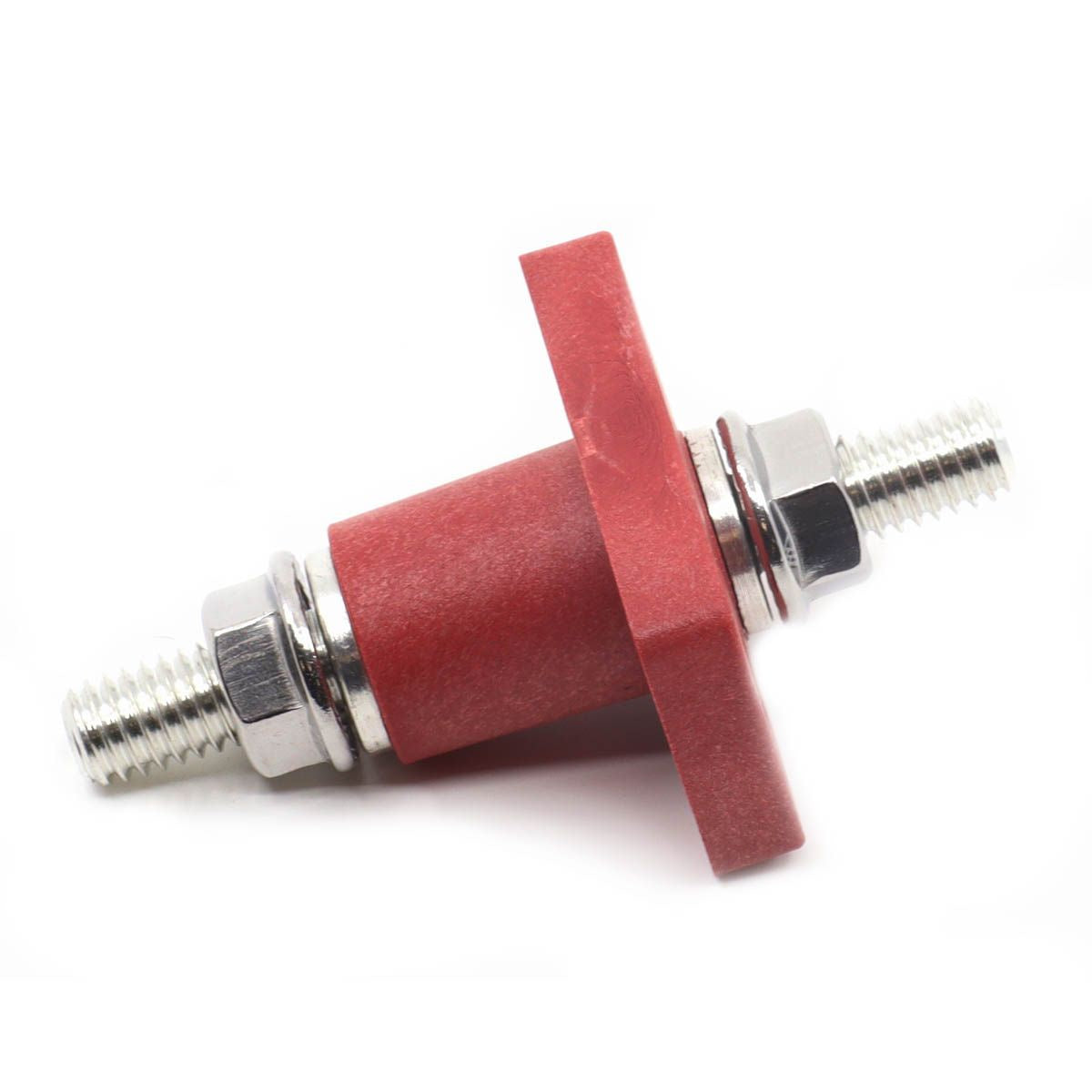 Red terminal feed through connector with 3/8"-16 studs. Sold Singularly.
