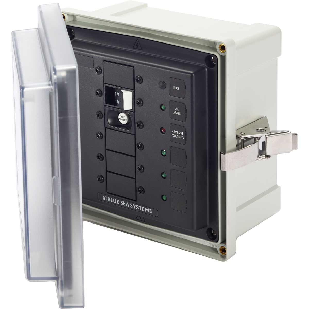 Panel enclosure for ELCI Main circuit breakers and other large frame devices. Meets ABYC E-11 when used with an ELCI Main circuit breaker and mounted within 10 feet of the shore power inlet.