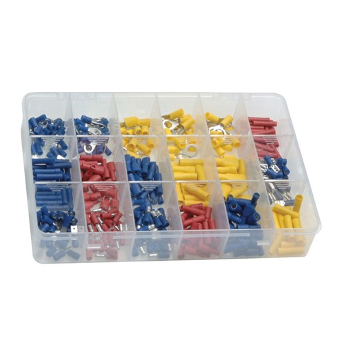 Auto Marine assortment box containing a range of pre insulated crimp terminals. There are 18 different varieties of electrical terminal, equalling 385 terminals in total. The following crimp terminals are included: