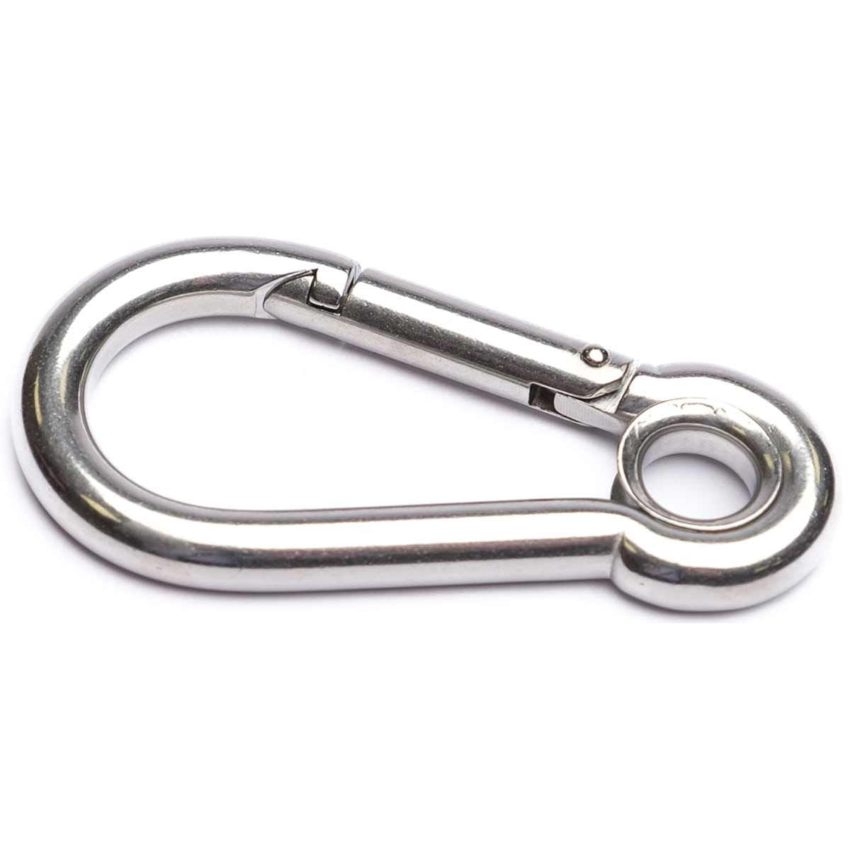 Snap hook constructed from stainless steel including eyelet. Perfect for hooking wires or ropes. 10mm x 100mm.