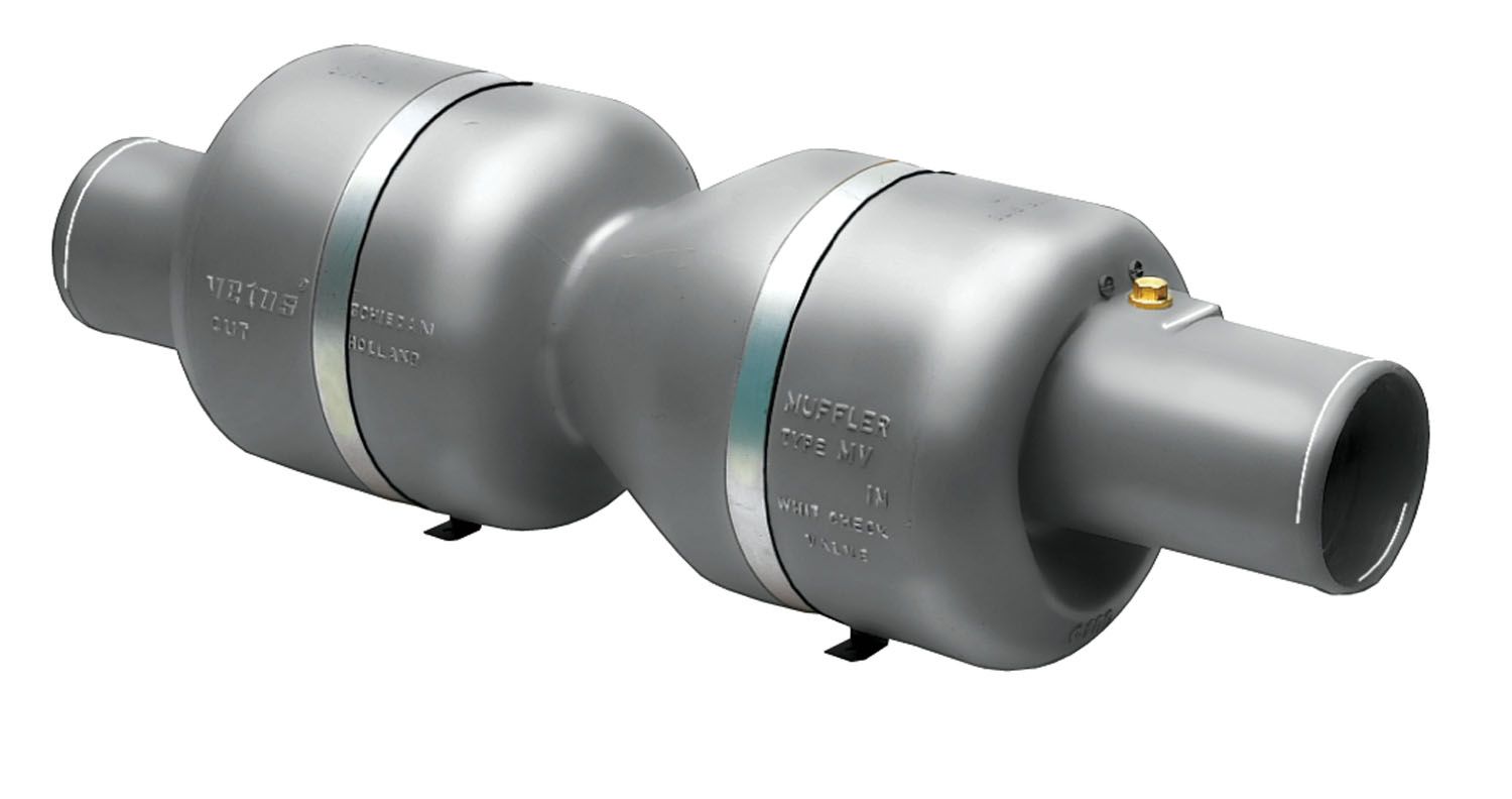 These compact mufflers combine a tremendous reduction of exhaust noise with minimal back pressure. All parts are made of lightweight, corrosion-free synthetic materials. The transom connections for this system are available in stainless steel (AISI 316) or reinforced black plastic. Type MV mufflers and the transom connection are provided with a check valve which prevents seawater from flowing into the engine. Specifications