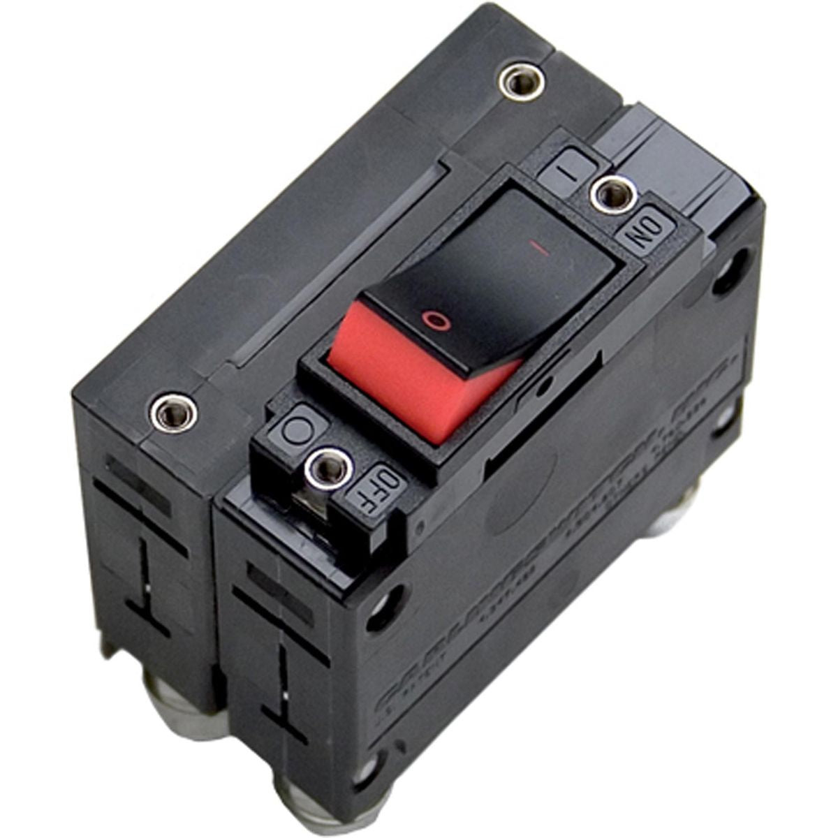Mastervolt circuit breaker, which can also be used as a rocker switch if connected directly to the equipment. It is a double pole breaker set to trip at 30 Amps. Double pole breakers are usually used in 230V systems, which interrupt the current both in the phase and neutral wires. This circuit breaker satisfies all the requirements of CE/UL/CSA and ABYC.