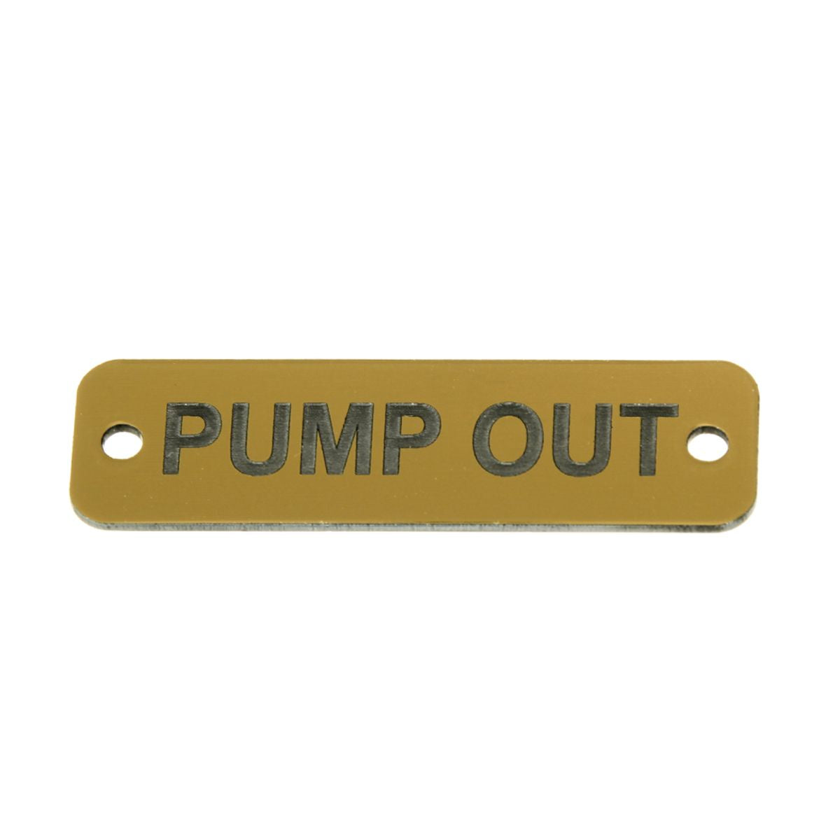 Gold 'Pump Out' label with black engraving and two drill holes.