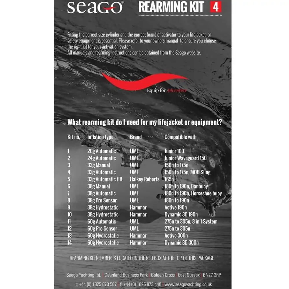 Seago Re-Arming Kits are the genuine spares for Seago Lifejackets and ensure maximum security. Seago Re-Arming Kits must be used to validate Seago warranty. 33g