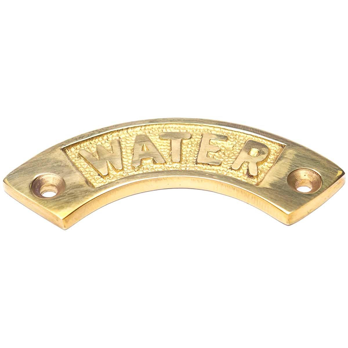 A curved 'Water Deck Filler' nameplate constructed with a chrome finish.