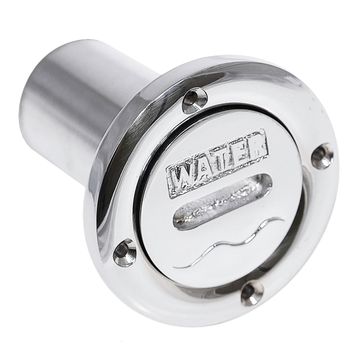 Water filler, constructed from chrome plated brass and will fit a 38mm ID hose. The chromed brass deck filler is supplied with a neoprene O-ring seal and has a slotted cap and four countersunk fixing holes.
